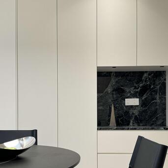 餐厅两面墙都打了柜子,饮水机和冰箱都提前预留尺寸,零嵌设计非常美观。收纳型岛台弧线优美,黑色岩板餐桌质地高级。