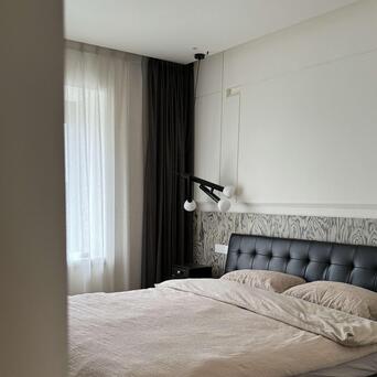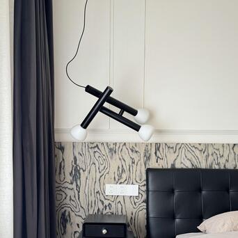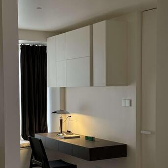 书房悬浮书桌设计,吊柜做了脱缝造型。电视墙和床头背景墙,都运用了斯卡帕叠级手法,使得空间更具层次感和趣味性。